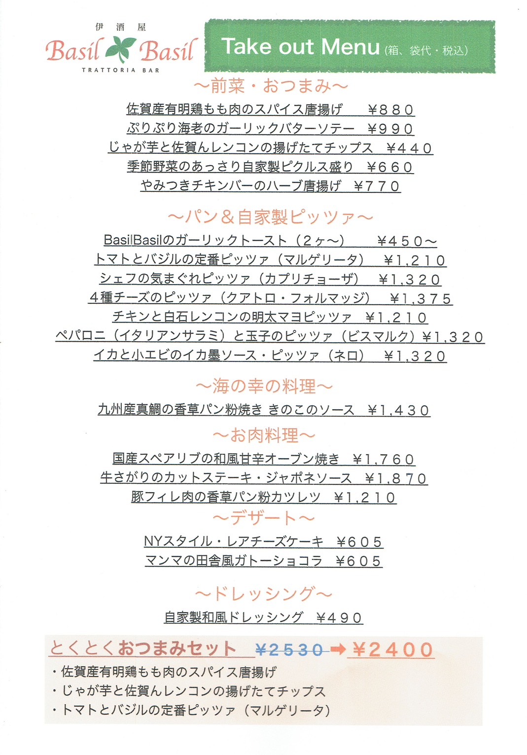 グランドメニューからお持ち帰り可能な料理とデザートを御覧下さい!